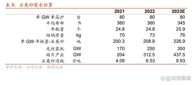 石英坩堝是硅片生產過程中的消材,目前尚無替代品。石英坩堝主要應用于光伏 及半導體領域的拉晶環(huán)節(jié),是硅片生產流程中的關鍵材料。在硅棒拉制過程中, 石英坩堝逐步向方石英轉化,一定時間后無法使用,需要更換新的石英坩堝,在 硅片環(huán)節(jié)生產過程中具備較強的消耗品屬性。 石英坩堝原材料為高純石英砂,目前與高純石英砂比較相似的產品是合成石英砂, 但因成本及微量元素含量的限制,無法使用于光伏領域。 預計 2023 年石英砂供需偏緊。需求方面,預計 2023 年全球光伏裝機 350GW, 假設每100GW硅片的石英消耗為1.8-2萬噸,則石英砂需求預計9.3-10.3萬噸; 供給方面,尤尼明+TQC 合計 2.5-3 萬噸產能,石英股份 4.5-5 萬噸,其他產能 合計約為 1 萬噸,供給預計在 8-9 萬噸。 此外,2023 年海外石英砂占總產能比重約為 35%左右,整體看,行業(yè)內石英坩 堝使用壽命會下降,石英砂需求會進一步提升,2023 年石英供需緊張相對明確, 漲價時間及幅度可能會超預期。
