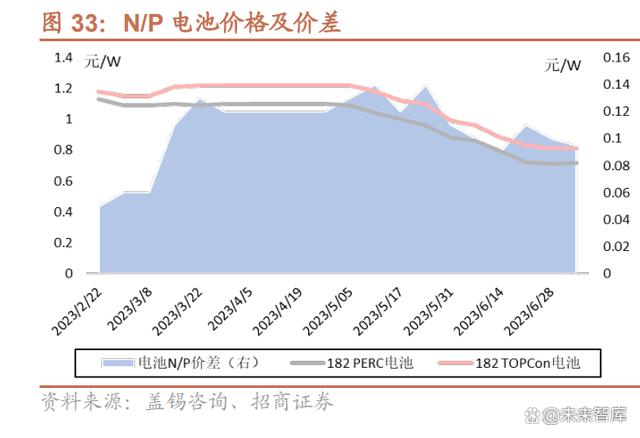下游接受度躍升。經歷 1 年多的市場驗證,下游投資方對 N 型優(yōu)勢理解更加深 刻。尤其是雙面率、衰減及溫度系數(shù)等優(yōu)勢帶來的發(fā)電量增益,隨實際應用的實 證數(shù)據(jù)逐步體現(xiàn),TOPCon 已得到行業(yè)性的認可。近期部分招標項目 N 型份額 已由此前 10%上下提升至近 50%。2021 年 PERC 市占率約 91%,2022 年降至 88%,而 N 型份額由 2021 年 3%提升至 9%,N 型電池進入規(guī)?;瘧秒A段。 溢價不斷放大。近期 N 型組件與 P 型組件的價差,已由 2 月的 0.05 元/W 逐步 攀升至 0.06-0.14 元/W(近期組件報價偏分散),整體溢價逐步放大,原因主要 系隨 N 型產品進一步降本增效、電站有效驗證的形成,TOPCon 優(yōu)勢不斷驗證, 下游對 N 型組件的需求優(yōu)先級更高,高效組件的議價能力更強。如果效率繼續(xù)提 升,溢價有望進一步放大。而 TOPCon 電池供應相對緊張,相較 PERC 溢價由 0.06 元/W 上下爬升至 0.1 元/W。