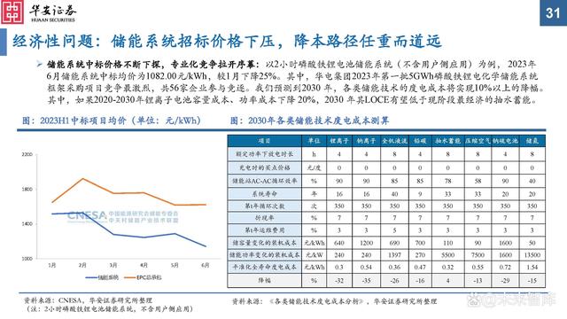 經(jīng)濟(jì)性問(wèn)題:儲(chǔ)能系統(tǒng)招標(biāo)價(jià)格下壓,降本路徑任重而道遠(yuǎn)。儲(chǔ)能系統(tǒng)中標(biāo)價(jià)格不斷下探,專業(yè)化競(jìng)爭(zhēng)拉開(kāi)序幕:以2小時(shí)磷酸鐵鋰電池儲(chǔ)能系統(tǒng)(不含用戶側(cè)應(yīng)用)為例,2023年6月儲(chǔ)能系統(tǒng)中標(biāo)均價(jià)為1082.00元/kWh,較1月下降25%。其中,華電集團(tuán)2023年第一批5GWh磷酸鐵鋰電化學(xué)儲(chǔ)能系統(tǒng)框架采購(gòu)項(xiàng)目競(jìng)爭(zhēng)最激烈,共56家企業(yè)參與競(jìng)逐。我們預(yù)測(cè)到2030 年,各類儲(chǔ)能技術(shù)的度電成本將實(shí)現(xiàn)10%以上的降幅。其中,如果2020-2030年鋰離子電池容量成本、功率成本下降 20%,2030 年其LOCE有望低于現(xiàn)階段最經(jīng)濟(jì)的抽水蓄能。