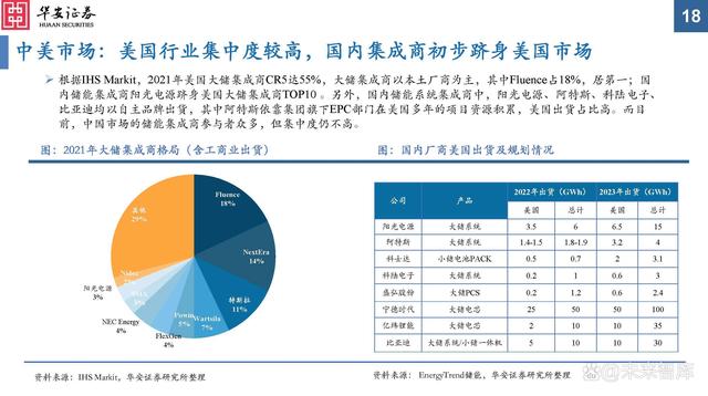 根據(jù)IHS Markit,2021年美國(guó)大儲(chǔ)集成商CR5達(dá)55%,大儲(chǔ)集成商以本土廠商為主,其中Fluence占18%,居第一;國(guó)內(nèi)儲(chǔ)能集成商陽(yáng)光電源躋身美國(guó)大儲(chǔ)集成商TOP10 。另外,國(guó)內(nèi)儲(chǔ)能系統(tǒng)集成商中,陽(yáng)光電源、阿特斯、科陸電子、比亞迪均以自主品牌出貨,其中阿特斯依靠集團(tuán)旗下EPC部門在美國(guó)多年的項(xiàng)目資源積累,美國(guó)出貨占比高。而目前,中國(guó)市場(chǎng)的儲(chǔ)能集成商參與者眾多,但集中度仍不高。