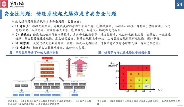 起火爆炸是儲(chǔ)能系統(tǒng)的首要安全問(wèn)題,其特點(diǎn)有: 1)原因多:根據(jù)失效形式,導(dǎo)致熱失控的原因可分為三類:①機(jī)械濫用,如擠壓、碰撞、針刺等;②電濫用,如過(guò)度充/放電、低溫充電、過(guò)高倍率充電等;③熱濫用,如著火、環(huán)境溫度過(guò)高等。 2)荷載大:儲(chǔ)能電站儲(chǔ)存荷載電量較多,其內(nèi)含電池?cái)?shù)量多、模塊組數(shù)多,電站的電流電壓高、容量大,一旦發(fā)生故障,熱失控傳遞速度較快,發(fā)生鏈?zhǔn)椒磻?yīng),能量大規(guī)模集中釋放,從而引發(fā)大規(guī)模的劇烈燃燒、爆炸事故。3)副作用: 火災(zāi)過(guò)程大致分為升溫、初爆、漏液和復(fù)燃階段,過(guò)程中易產(chǎn)生有毒有害氣體,造成次生傷害。 4)難度大:電池類火災(zāi)撲救難度大,無(wú)特效滅火劑。