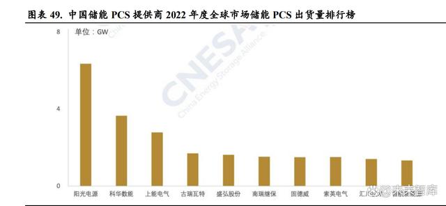當(dāng)前儲能 PCS 生產(chǎn)廠商眾多,與光伏逆變器廠商高度重合。儲能變流器與光伏逆變器的最主要 作用都是實(shí)現(xiàn)交直流的轉(zhuǎn)換,所以兩種產(chǎn)品的主要零部件類似,且在應(yīng)用端也開始呈現(xiàn)高度的協(xié) 同效應(yīng)。在光伏 PCS 已經(jīng)取得非常大的市場規(guī)模的前提下,未來儲能 PCS 的競爭格局與光伏逆 變器趨同,延續(xù)光伏 PCS 格局。當(dāng)前儲能 PCS 行業(yè)賽道參與者眾多,來自光伏逆變器、不間斷 電源(UPS)、充電樁(EV charger)、電網(wǎng)側(cè)-輸配電設(shè)備(PTD、MVD、APF、SVG)等多領(lǐng) 域廠商。據(jù) CNESA 數(shù)據(jù),2022 年度全球市場中儲能 PCS 出貨量排名前十位的中國儲能 PCS 提 供商,依次為陽光電源、科華數(shù)能、上能電氣、古瑞瓦特、盛弘股份、南瑞繼保、固德威、索英 電氣、匯川技術(shù)和首航新能源。