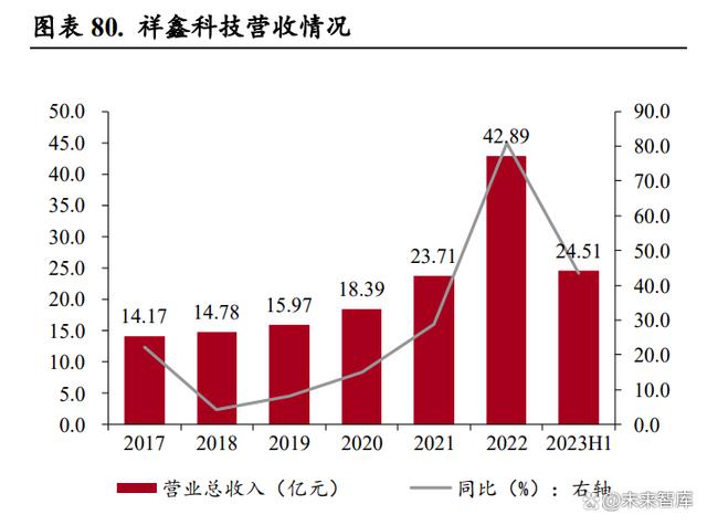 公司營收增長迅速,新能源、儲能精密沖壓模具及金屬結(jié)構(gòu)件貢獻(xiàn)營收逐年增加。公司營業(yè)收入從 2017 年的 14.17 億元增加到 2022 年的 42.89 億元,年均復(fù)合增長率達(dá)到 24.80%,2023 年上半年實(shí)現(xiàn)營業(yè)收入 24.51 億元,同比增長 43.38%。分產(chǎn)品來看,2019 年以來新能源汽車零部件和儲能設(shè)備 結(jié)構(gòu)件業(yè)務(wù)占總營收比例明顯提升,其中 2022 年新能源汽車產(chǎn)品收入占比達(dá) 59.62%,成為公司主 要的收入來源,給公司帶來新的收入增長點(diǎn)。