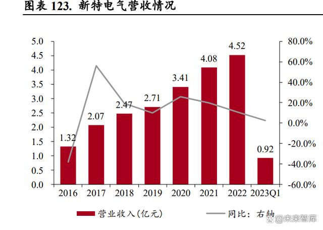 公司營業(yè)收入快速增長,干式變壓器貢獻(xiàn)主要收入。公司客戶包括新能源、高端裝備、高效節(jié)能、 工業(yè)企業(yè)電氣配套、基礎(chǔ)設(shè)施、民用住宅、傳統(tǒng)發(fā)電與供電、新型基礎(chǔ)設(shè)施等領(lǐng)域,其中新能源的 營收占比最高,是公司主要收入來源。受益于新能源領(lǐng)域的良好發(fā)展,公司營業(yè)收入從 2017 年的 20.11 億元增加到 2022 年的 47.46 億元,CAGR 達(dá) 18.73%,2023 年一季度實(shí)現(xiàn)營業(yè)收入 12.97 億元, 同比增長 41.06%,繼續(xù)保持增長態(tài)勢。分產(chǎn)品看,2017-2022 年干式變壓器系列收入占比 70%左右, 為公司主要的營收來源,儲能業(yè)務(wù)和數(shù)字化整體解決方案業(yè)務(wù)起步,給公司帶來新的收入增長點(diǎn)。