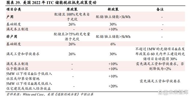 儲能稅收減免提升至以 30%為基礎(chǔ),經(jīng)濟(jì)性進(jìn)一步提升。 此前的 ITC 政策稅收抵免的基礎(chǔ)額度為 26%,現(xiàn)在在滿足工資和學(xué)徒要求后,基礎(chǔ)抵免可以達(dá)到 30%,另外,如果同時(shí)能夠滿足其他條件, 例如本土制作、位于能源社區(qū)等可進(jìn)一步提升抵免的額度,儲能電站的經(jīng)濟(jì)性得到進(jìn)一步提升。