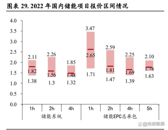儲能系統(tǒng)投標(biāo)價(jià)格持續(xù)下行,刺激需求釋放。根據(jù)儲能與電力市場公眾號的統(tǒng)計(jì),2022 年招標(biāo)的近 150個(gè)儲能項(xiàng)目中,2h 的儲能系統(tǒng)占比達(dá) 63%,平均報(bào)價(jià) 1.56 元/Wh;儲能 EPC 總承包招標(biāo)的近 120 個(gè)項(xiàng)目中,2h 的 EPC 項(xiàng)目占比達(dá) 77%,平均報(bào)價(jià) 1.81 元/Wh。從時(shí)間維度上來看,2022 年儲能系 統(tǒng)報(bào)價(jià)呈現(xiàn)出了“兩頭高中間低”的特點(diǎn),并且從 5 月起持續(xù)穩(wěn)定在 1.5-1.6 元/kWh 的范圍之內(nèi), 而進(jìn)入 2023 年之后,隨著電芯主要原材料碳酸鋰價(jià)格的進(jìn)入下行通道,儲能系統(tǒng)報(bào)價(jià)屢創(chuàng)新低,2023 年 7 月份 2 小時(shí)儲能系統(tǒng)的平均報(bào)價(jià)為 1.12 元/Wh,同比下降 28.24%,環(huán)比下降 0.88%,最低報(bào)價(jià) 低至 1.00 元/Wh,而 4 小時(shí)儲能系統(tǒng)最低報(bào)價(jià)低至 0.87 元/Wh。儲能系統(tǒng)價(jià)格的快速下降,將有力 提升大儲項(xiàng)目業(yè)主方的投資積極性,推動項(xiàng)目的建設(shè)進(jìn)程。
