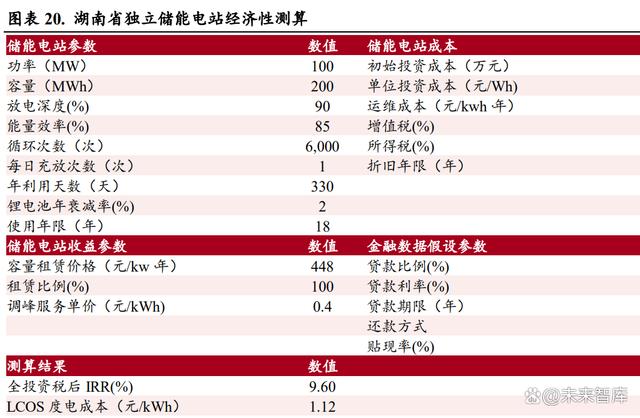 獨(dú)立儲能電站經(jīng)濟(jì)性可觀。我們以湖南省的實(shí)際情況為例,來測算獨(dú)立儲能電站的經(jīng)濟(jì)性,在目前 的各種條件下,湖南省獨(dú)立儲能電站的全投資稅后 IRR 達(dá)到 9.60%,具有客觀的收益性。 1)容量租賃收入假設(shè):參考湖南省的城步儒林 100MW/200MWh 儲能電站項(xiàng)目已經(jīng)簽訂的容量租賃 合同,湖南省的容量租賃價(jià)格為 448 元/kw*年。2)電力輔助服務(wù)收入假設(shè):電力輔助服務(wù)包括為電網(wǎng)公司提供調(diào)峰、調(diào)頻等服務(wù),按照每次調(diào)用規(guī) 模及調(diào)用次數(shù),電網(wǎng)公司給儲能電站支付費(fèi)用。 參考湖南省的現(xiàn)行 政 策以及城步儒林 100MW/200MWh 儲能電站項(xiàng)目的運(yùn)行情況,假設(shè)一年調(diào)用 330 天,每天一次充放,調(diào)用費(fèi)用為每 次 400 元/MWh。
