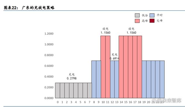 峰谷時段持續(xù)優(yōu)化,多省份滿足兩充兩放。根據(jù)各地區(qū)的分時電價策略,我們梳理出其對 應的峰谷套利策略,超 20 個省份已滿足兩充兩放的充放電策略,浙江、山西、新疆由于午 時為低谷電價,可實現(xiàn) 2 次“谷充峰放”策略,其余多數(shù)省份可采用“谷充峰放+平充峰放” 策略。江蘇、黑龍江、福建、翼北可實現(xiàn)三充三放(2.5 次滿充放)。多省份已經(jīng)具備較為 優(yōu)越的投資經(jīng)濟性。